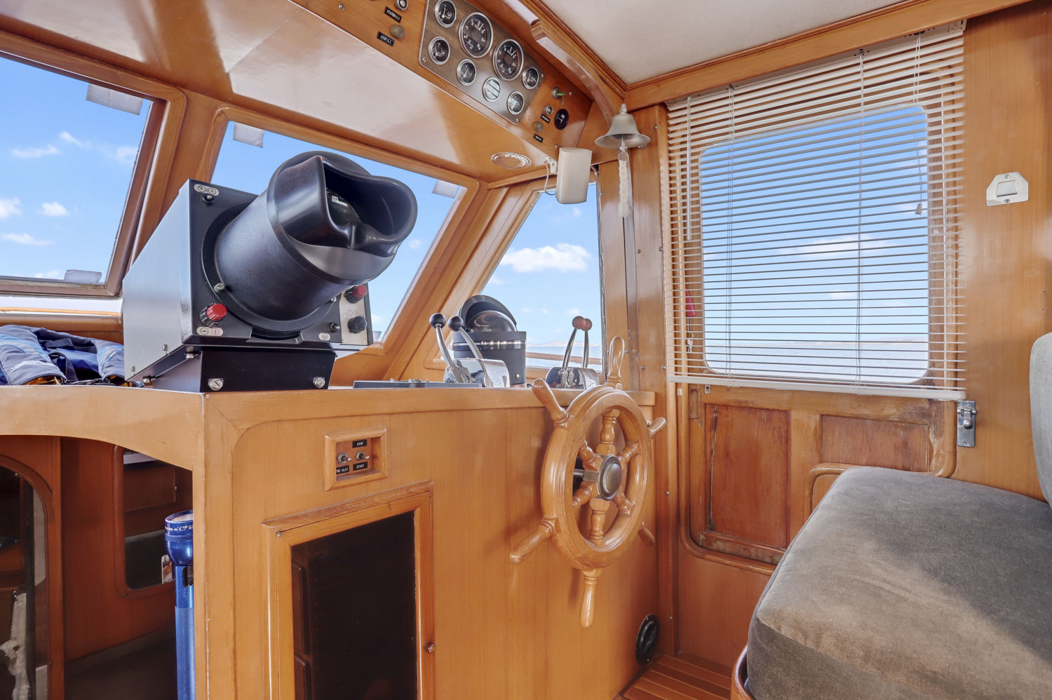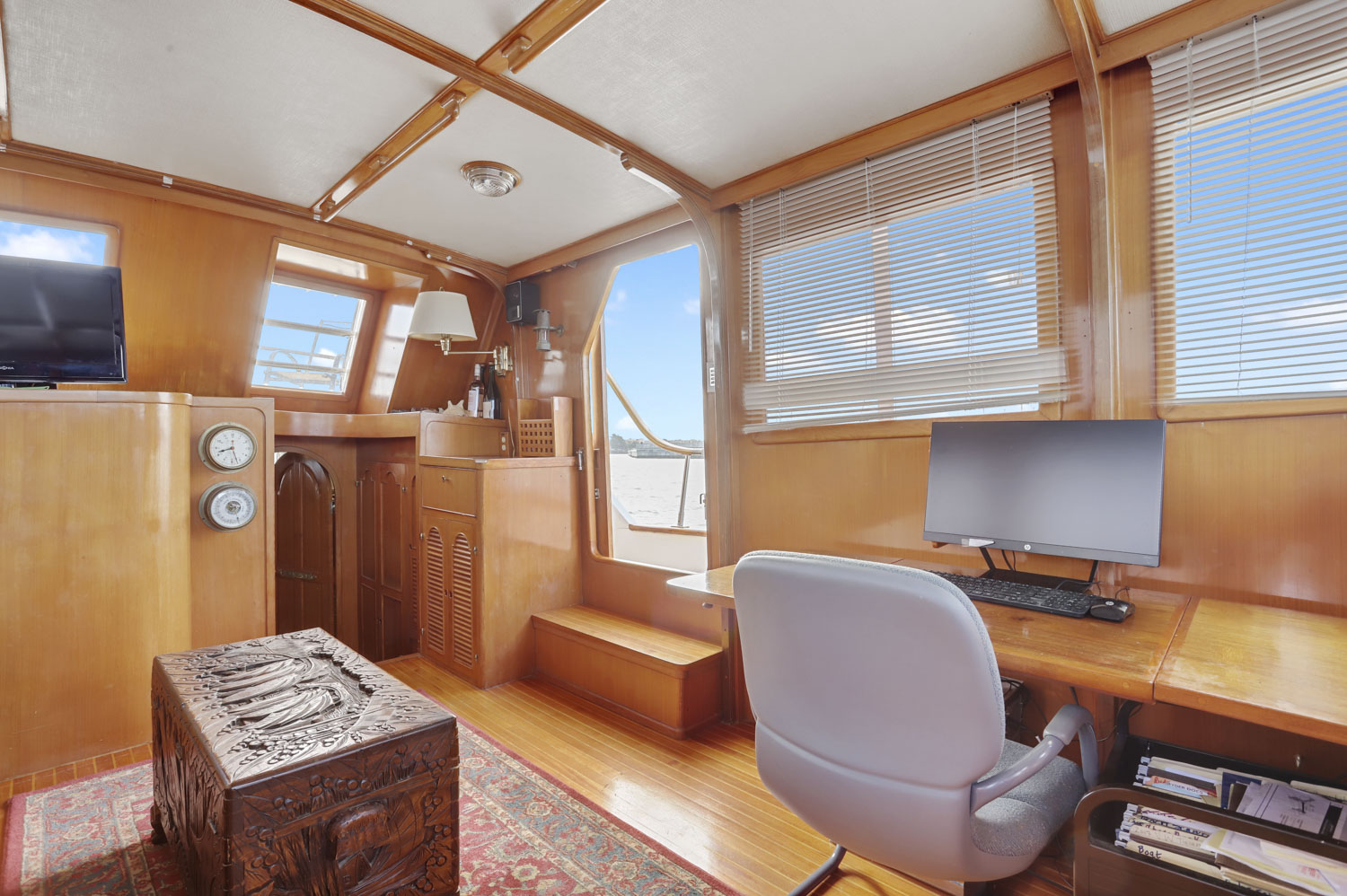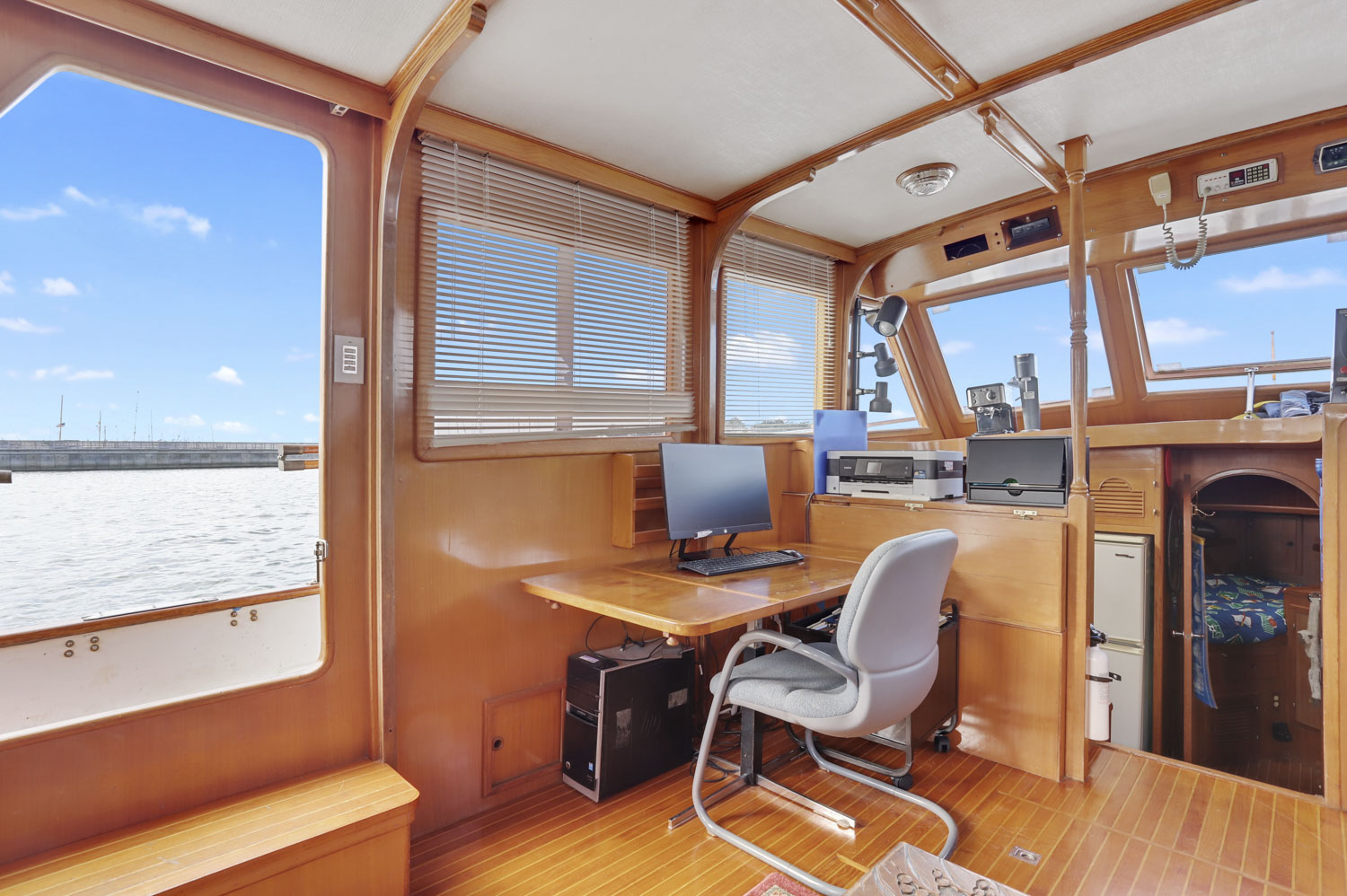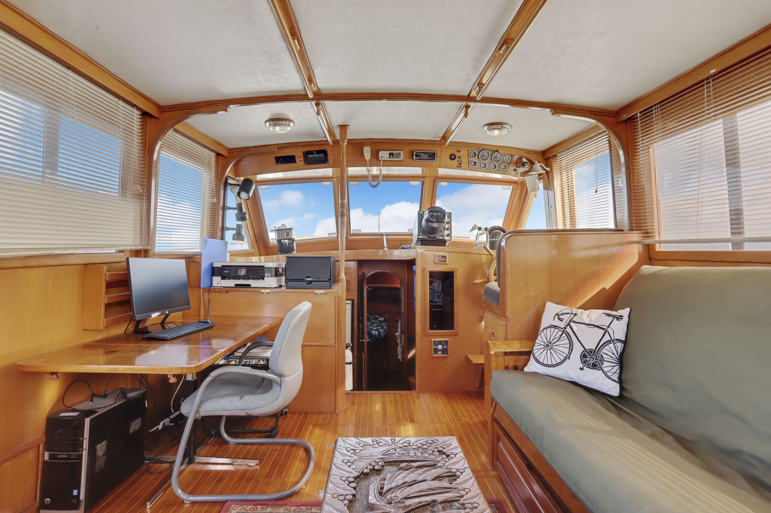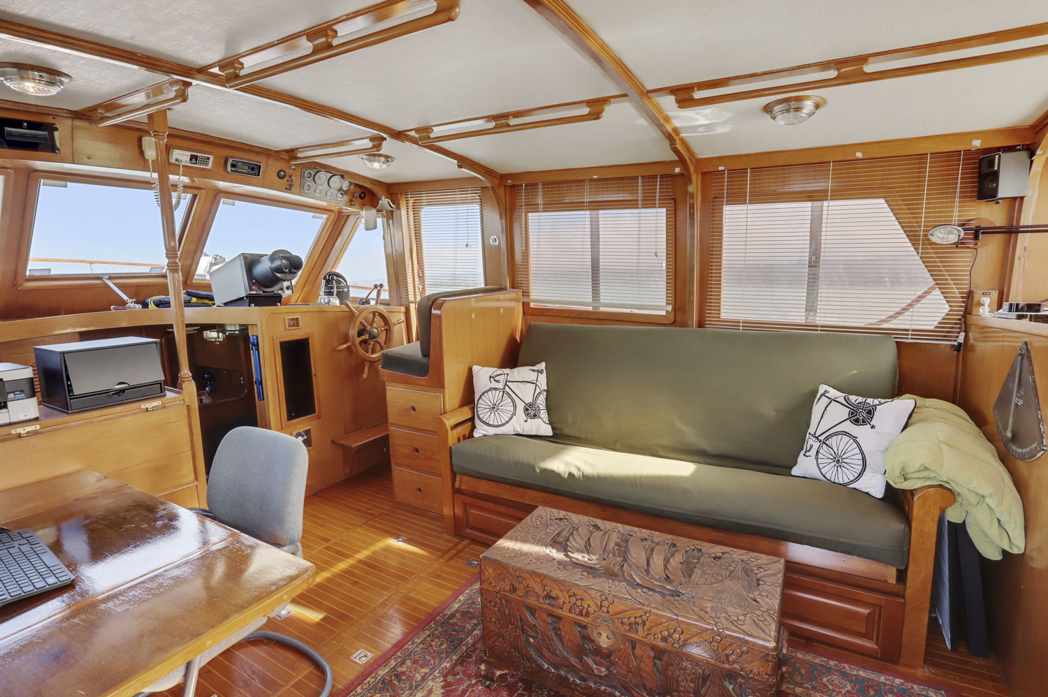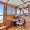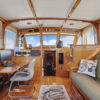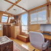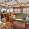 An open salon allows the owner the ability to arrange furniture, such as an included custom settee hide a bed and a table, whatever might suit your fancy. All this space is enclosed in a warm teak interior with teak and holly flooring everywhere. A second cabin in the bow with its own electric head provides additional guest accommodations.