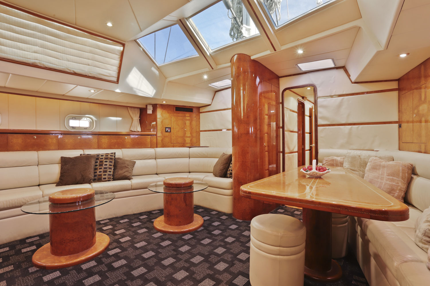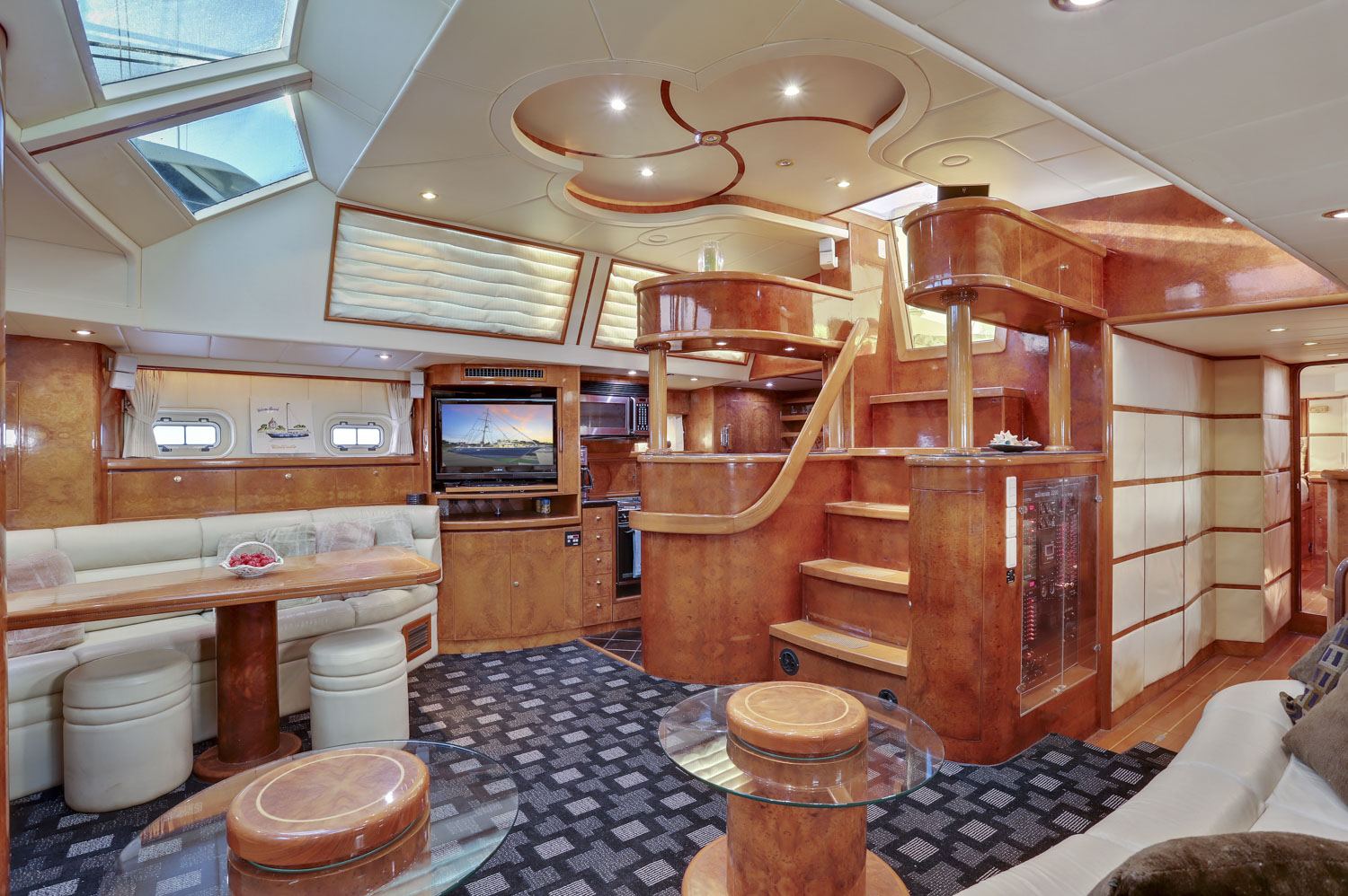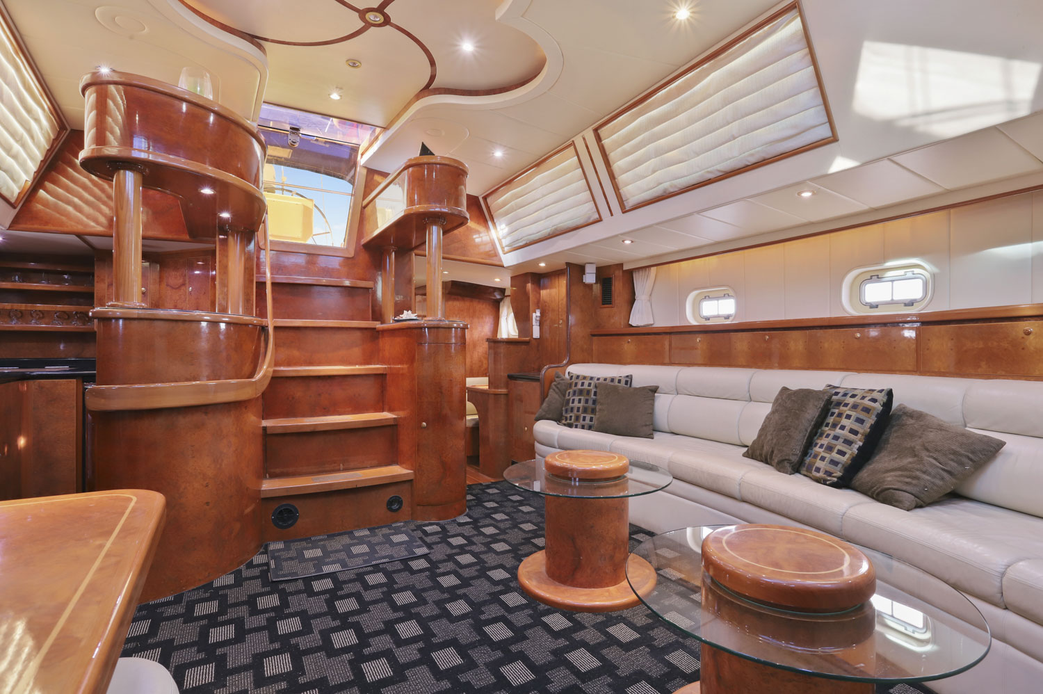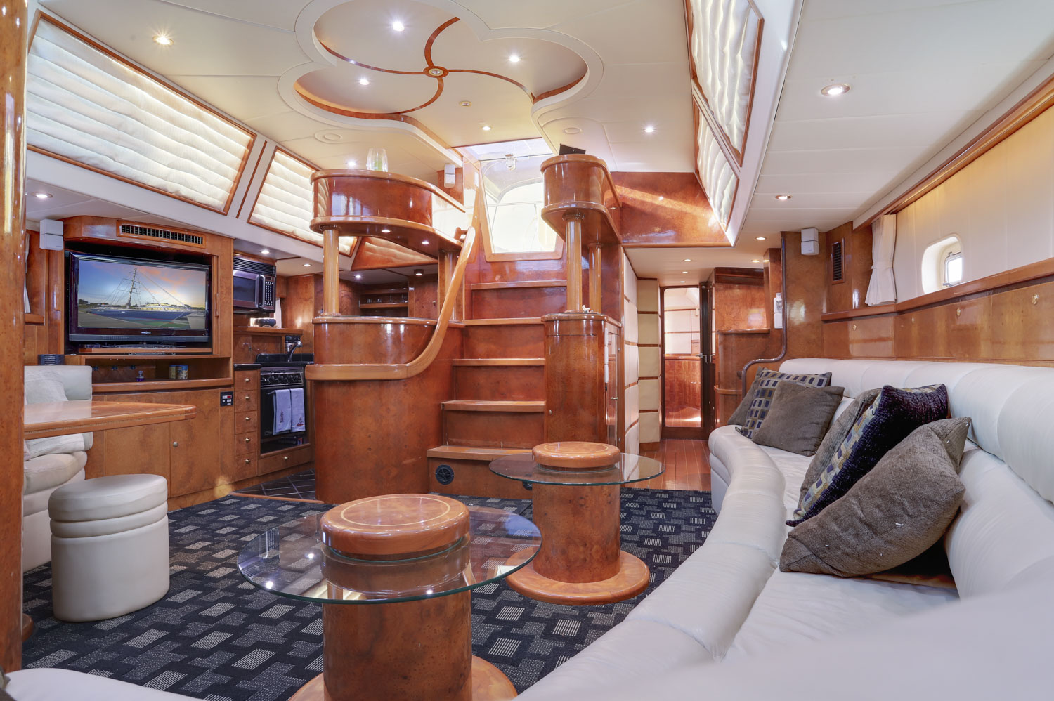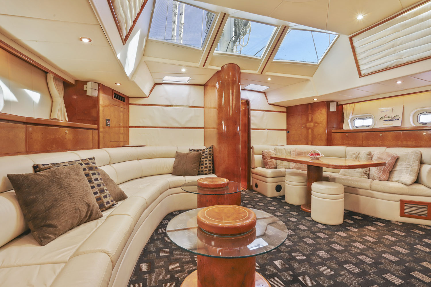 Wind Castle is a three stateroom vessel with three full heads. The master cabin benefits from a large aft cabin with full walk around queen size bed and well sized en-suite head. The VIP cabin is forward with an offset double berth. The VIP/day head is just to starboard with the third stateroom further forward with its own en-suite head.
