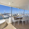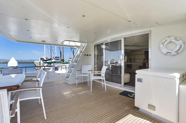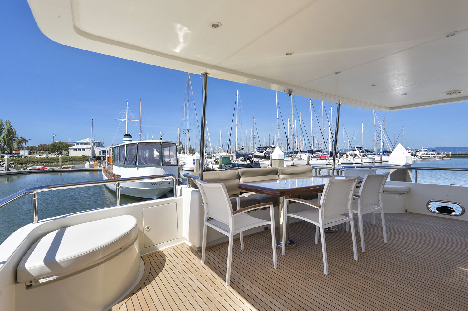 YACHT LADY is accessed from the wide teak swim platform (which doubles as a tender dock), up the portside staircase, which lands on the large, generously shaded teak stern lounge. This large aft lounge area features a varnished built-in-table with seating for ten (the aft bench fabric was updated in 2018). In addition, two loungers are set within the starboard and aft corners. What’s more, there’s much room for additional loose chairs for more guests. A Jenn-Aire propane BBQ serves guests niceley.
