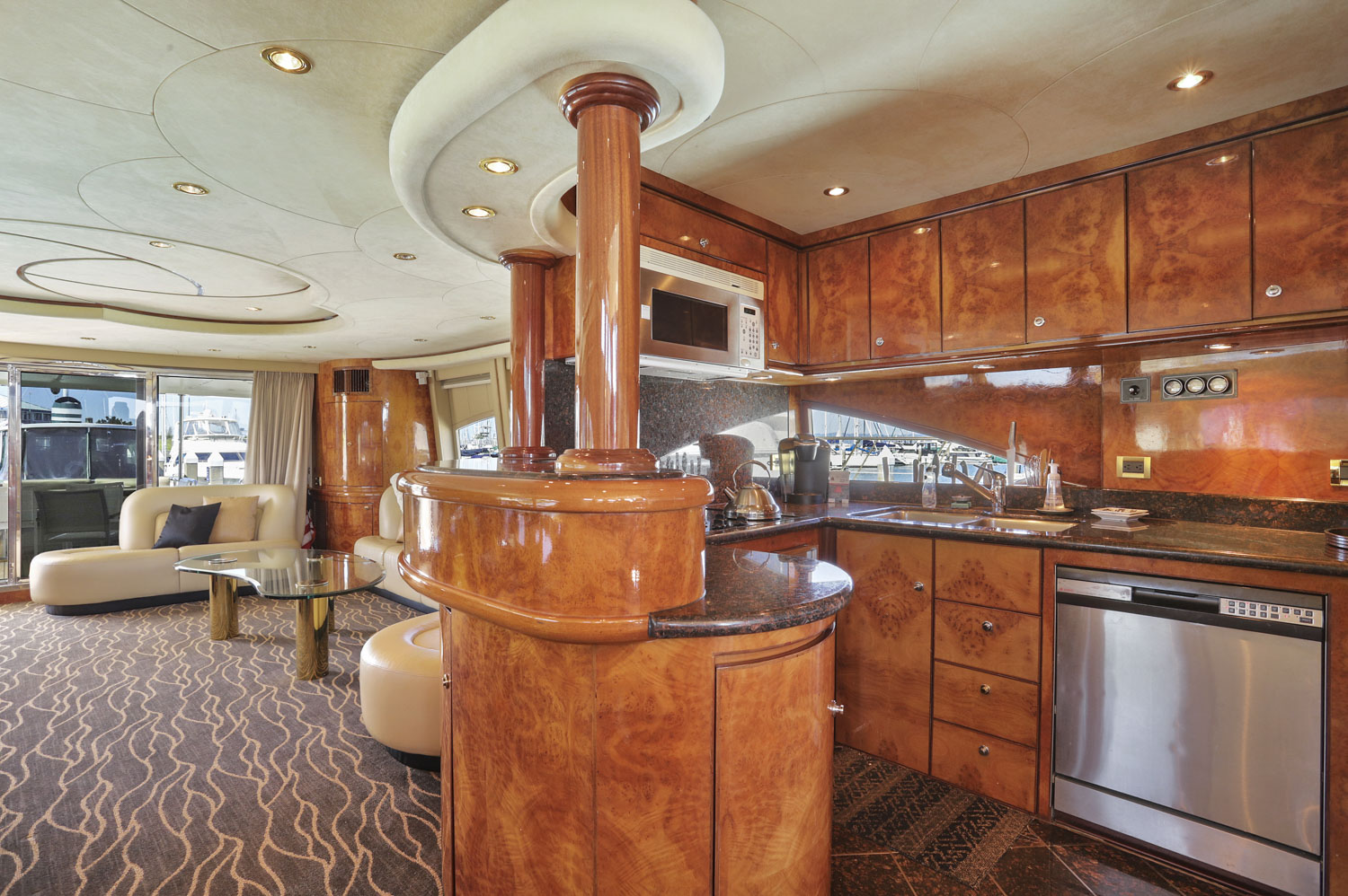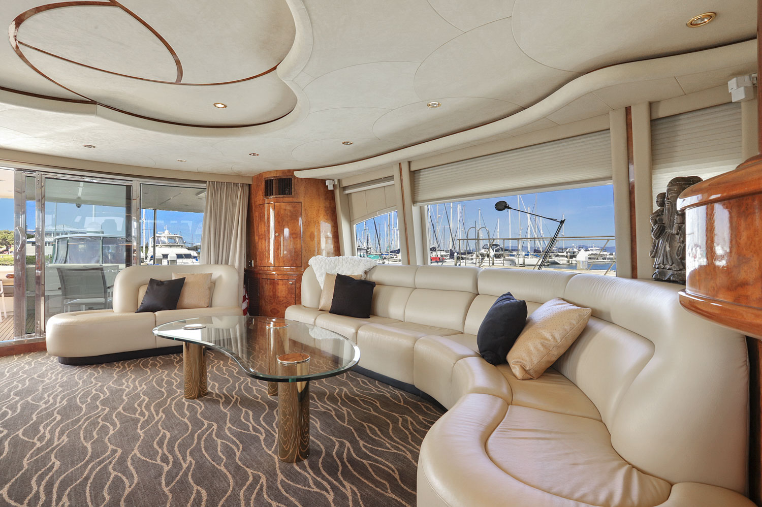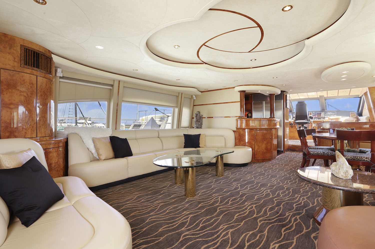Monte Fino yachts are noted for their much larger interior volume than other boats of a similar size, offering a surprising and often unrivaled level of spaciousness. Space is filled with a fine blend of curves, colors, and cherrywood. The cream and coffee-colored leather couches are curved. The 3-tiered cascading ceiling with its sculptured soffits are curved and accented by a curved pattern. The coffee tables, bar, and bulkheads are curved too. Sensuous curves and flowing forms are beautifully incorporated into many aspects of her interior design.