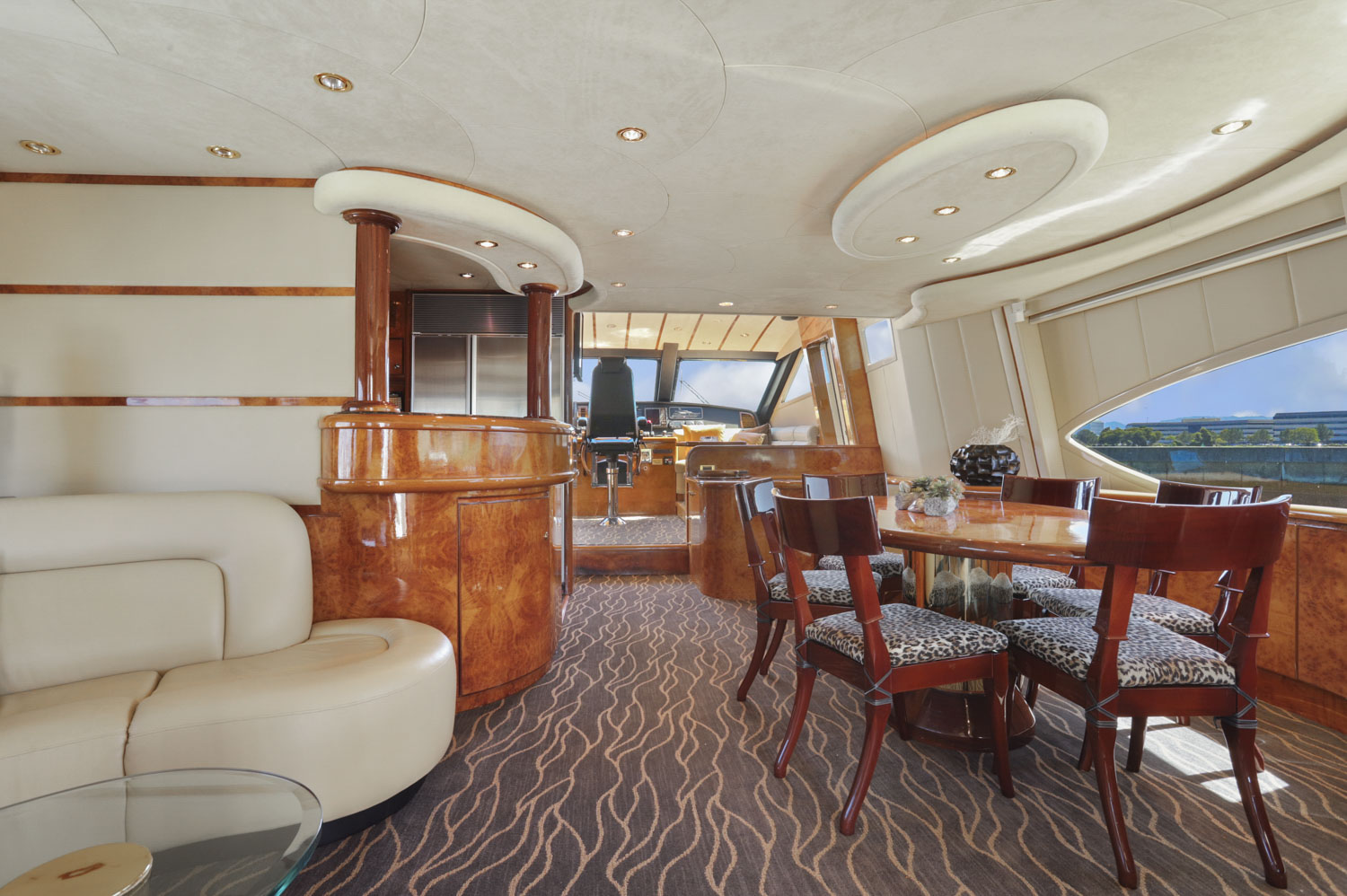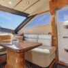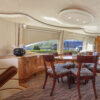 Flanking the salon’s sliding glass panels are a flybridge staircase to port and a wet bar to starboard. Nearly the entire area is sheltered by the fly-bridge overhang. Allowing you and your guests to dine, socialize, and relax outdoors while seeking respite from the blazing sun or rain. This large stern lounge is a prelude to the equally large and remarkable interior behind the sliding stainless-steel glass-doors. Sliding back, the doors open to reveal the wide-body salon that is in itself a piece of art. And this work of art runs the entire length of the superstructure.