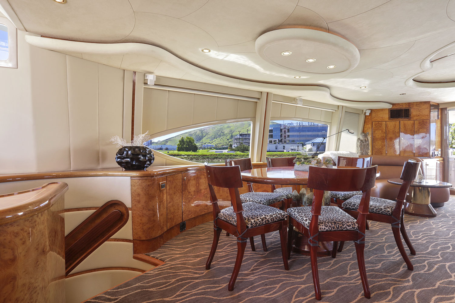 The curved, cherry wood bar is arranged for convenience, as cold drinks and appetizers are practically at your arm’s reach when enjoying the salon’s comforts or when dining at the dining table for 6.