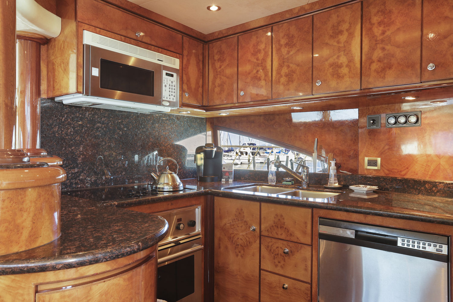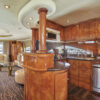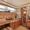 Set directly behind the helm station (to port) is the country-galley for family and friends to congregate before meals. The galley also strikes a balance between privacy while maintaining the vastness of the wide-body salon. As it creates a semi-private barrier between the helm and the port-side salon while allowing forward visibility (to the starboard side). Composed of copious amounts of cherry wood and dark marble tiles.