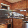 Here you will find an array of GE-appliances, which include a full-sized, double-door refrigerator/freezer and a flush-mounted, four-burner cooktop with stainless steel oven underneath. Moreover, other appliances include a microwave (with exhaust fan), dishwasher, two basin stainless steel sink, garbage disposal, and ice maker. As well, there are numerous cabinets which ensure there’s a place for everything. And there’s ample granite countertop space for creating meals or plating dishes.