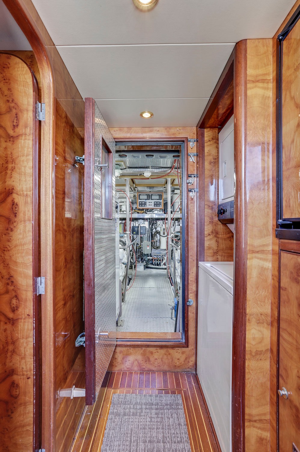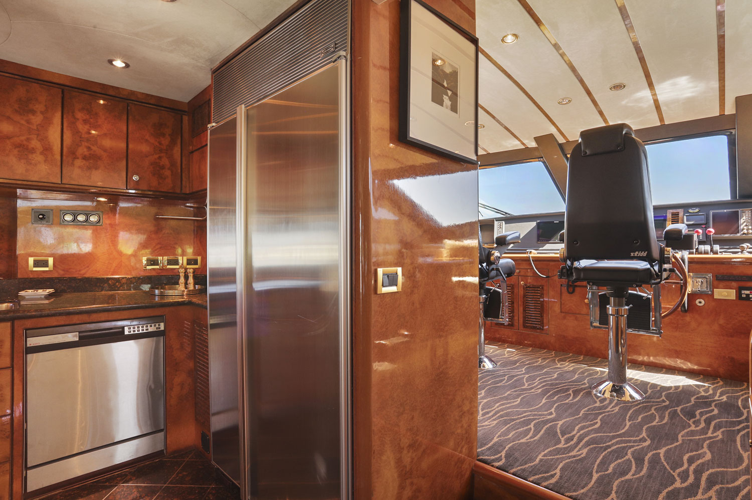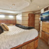 As for the captain, he can access his quarters from the aft, through the swim platform’s transom door. Typically, crew quarters are a mere afterthought. However, in this case, it is surprisingly nice. Like the yacht itself, it contains an ample amount of cherrywood, tons of storage (beneath the berth), a floor to ceiling hanging locker, and an ensuite head with shower. Nearby, there’s the the crew refrigerator and GE stacked washer/dryer and day head. If you choose to helm the yacht on your own, this room could be repurposed as a spare guest room under circumstances when you have invited all your friends and family.
