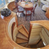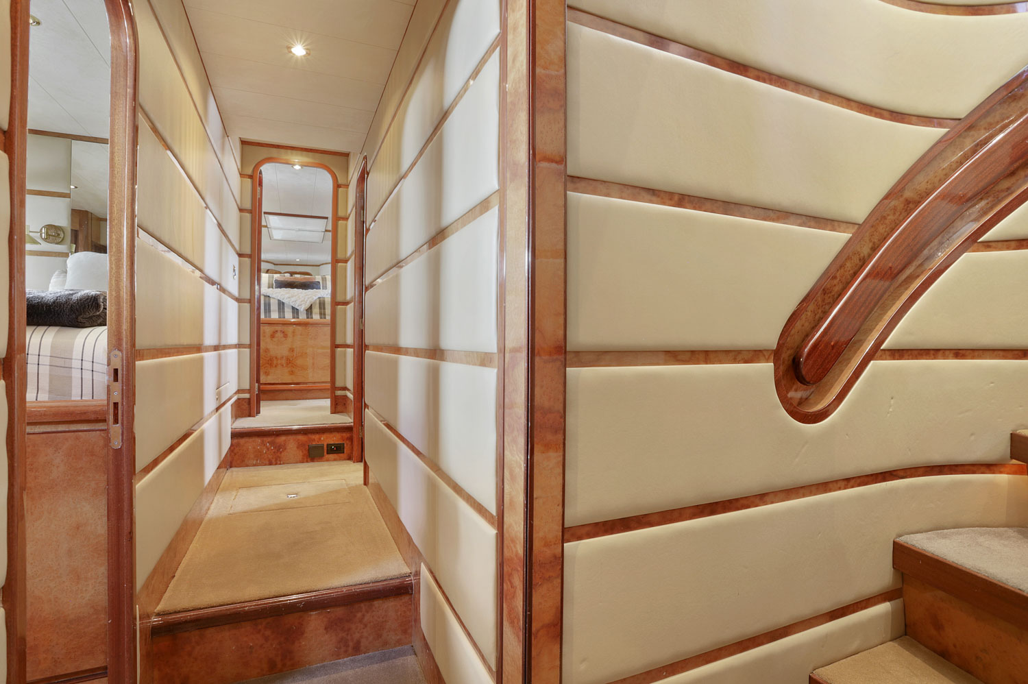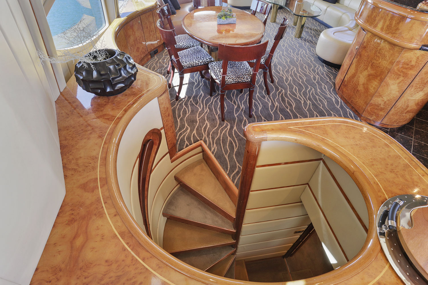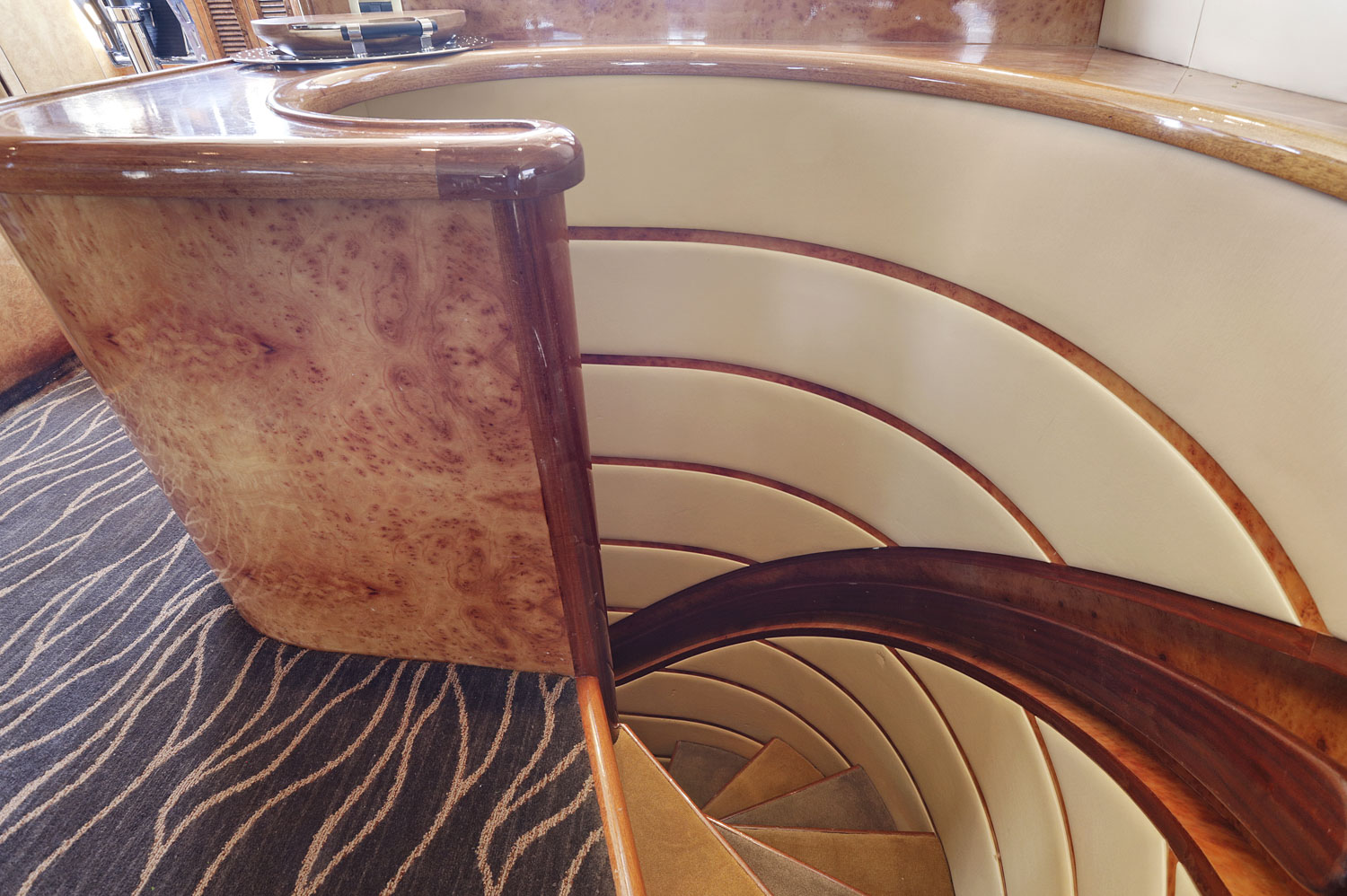 Set directly behind the pilothouse, to starboard, is another piece of artwork in the form of a curved staircase. Now, according to myth, fairy tales, and dreams, stairs descend into realms of mystery, magic, and treasure. In this case, this sweeping staircase of cherrywood descends into a palatial “treasure” below decks: the full-beam master stateroom. Here you can sense the touch of the Far East. All the curves, colors, and cherrywood from the salon continue into the master stateroom which spans the full 20ft beam.