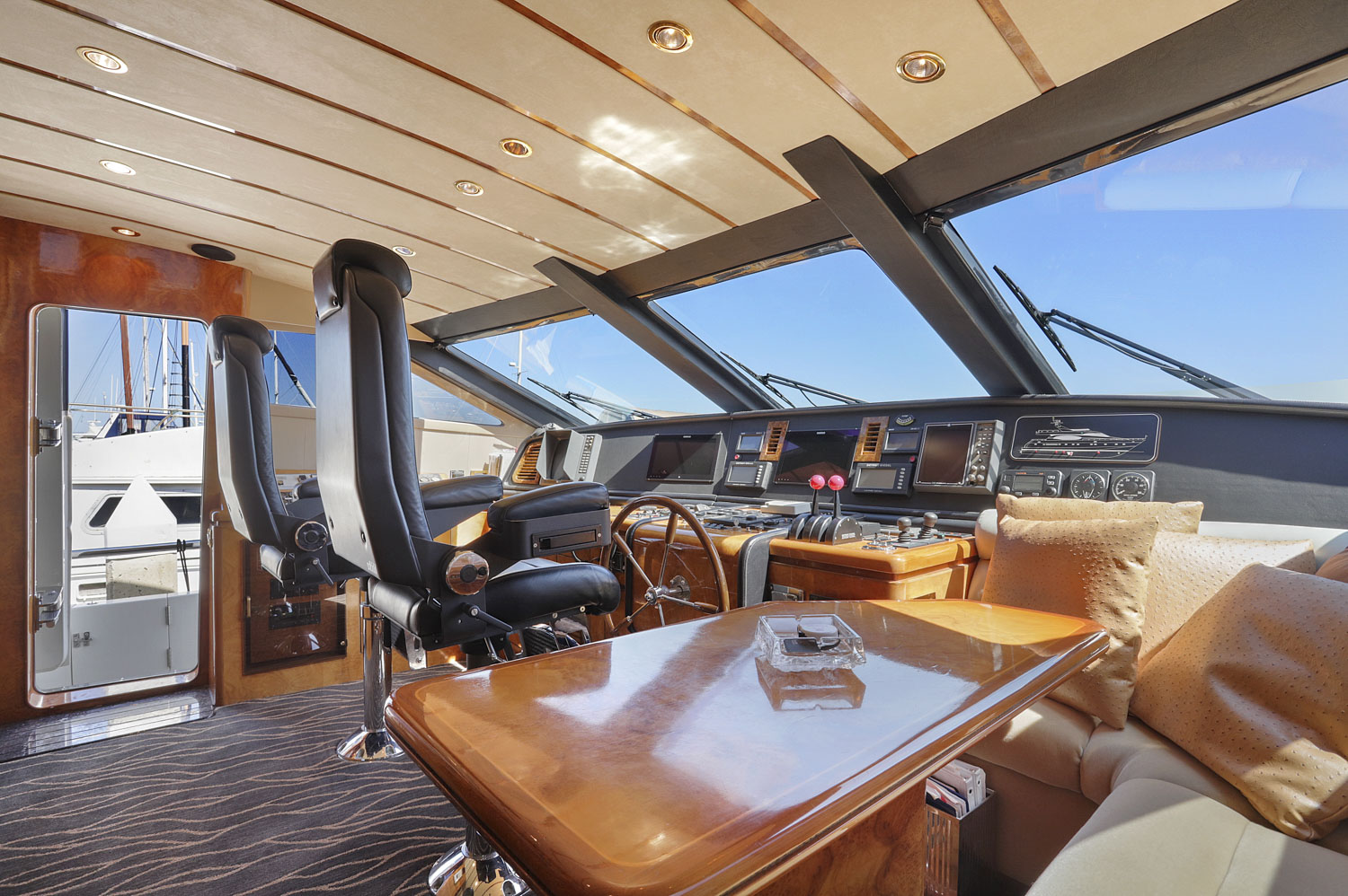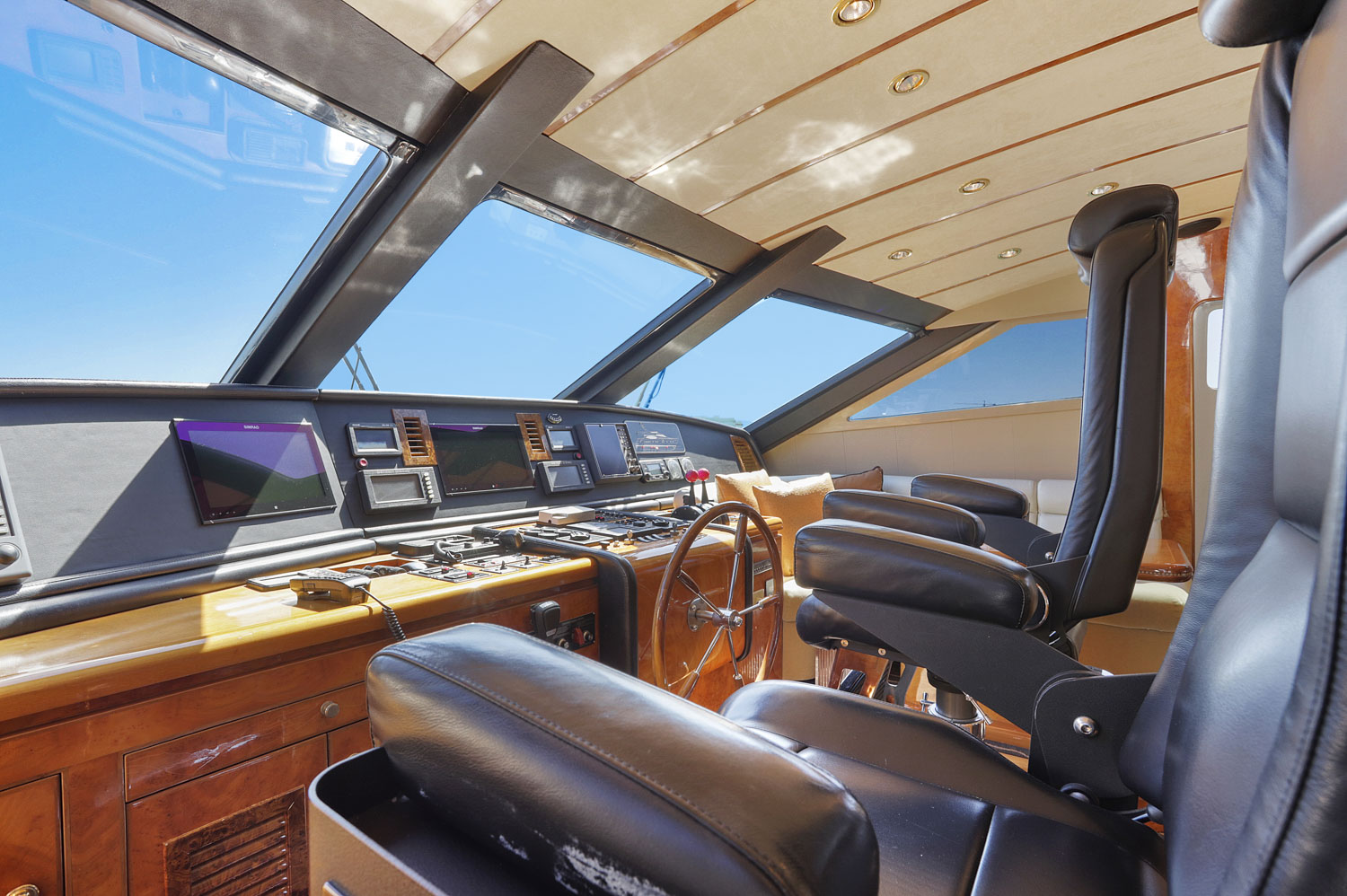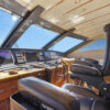 Forward and up a step from the salon, is the slightly raised and semi-private pilothouse equipped with two black leather pilot chairs and a cozy helm-station lounge. From the seating position, the helmsman has an excellent view forward and to the sides, making this the ideal all-weather steering station.