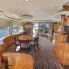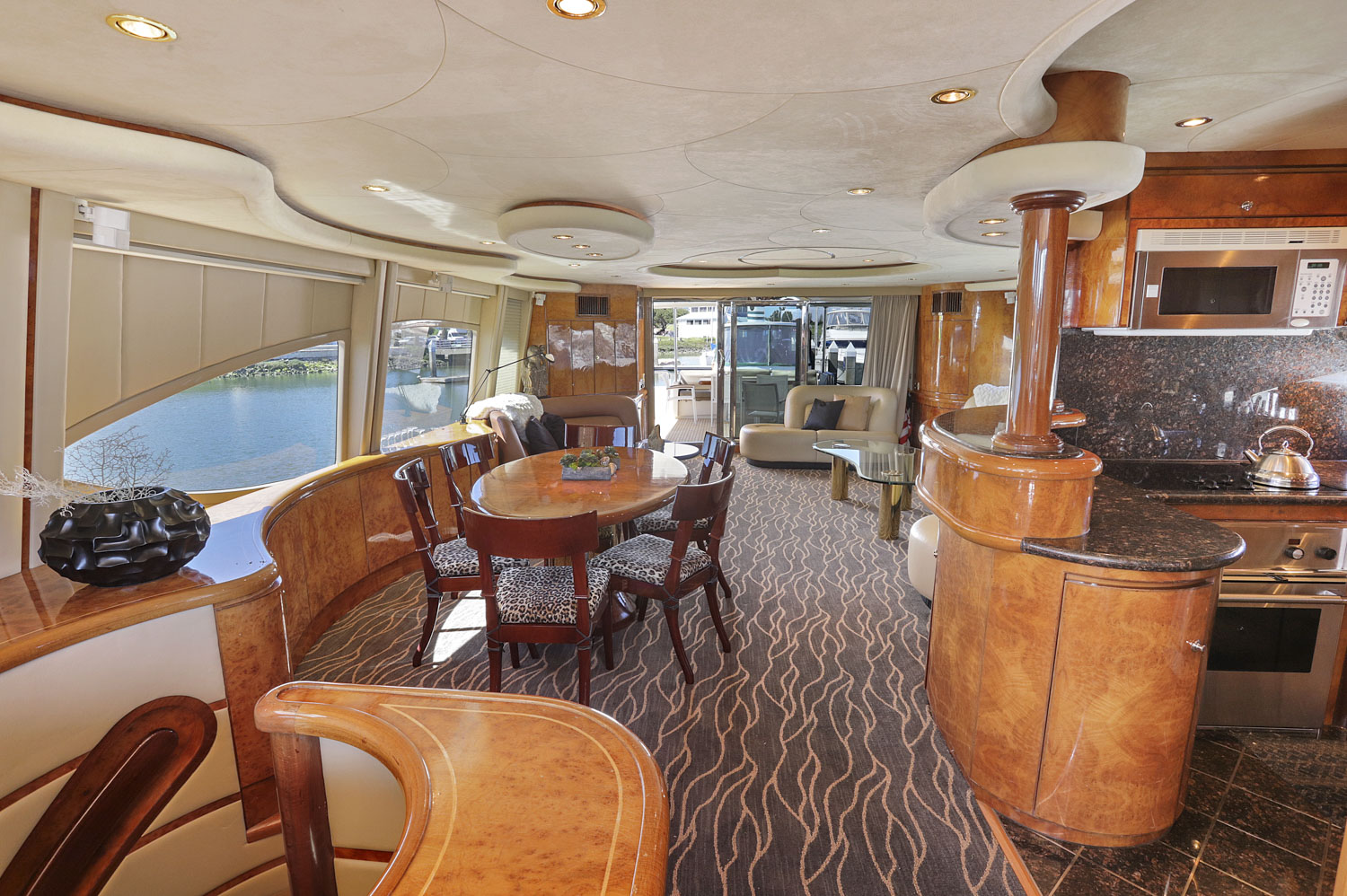 Set within her becalming atmosphere, are three settees (to port and aft) set around two glass coffee tables. Together, a dozen of you and your guests can relax, unwind, and socialize within her welcoming presence. The largest L-shaped settee (to port) faces a home theater-style entertainment system. There is a dining area for 6 and country-galley with bar, forward to port. The area was re-carpeted and re-upholstered in 2018.