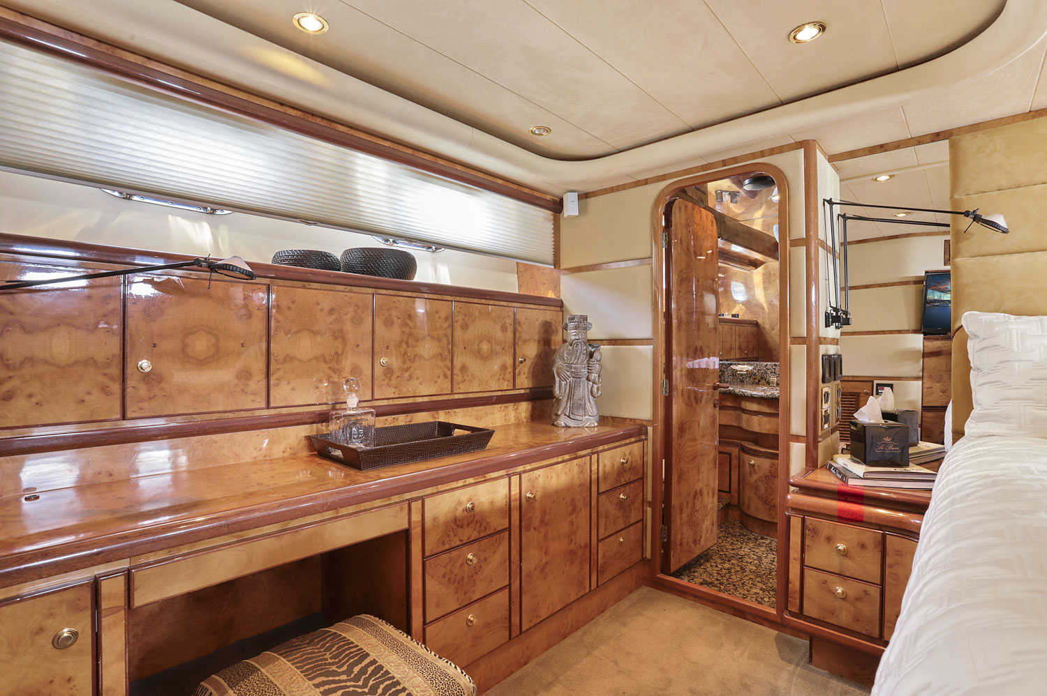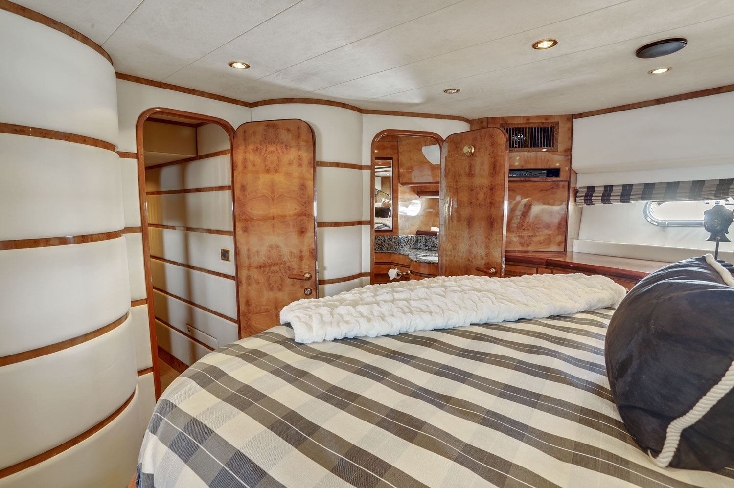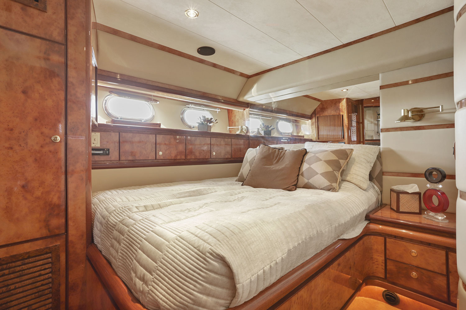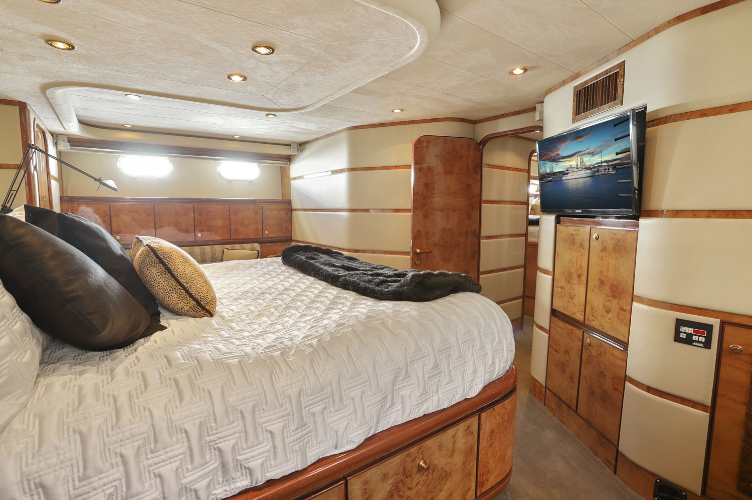 Set within an abundance of glass-smooth cheery woodwork is a centerline island, king-sized berth with twin nightstands, vanity to port, and large hanging lockers to starboard. The stylish king-size bed has a padded headboard flanked by two glass mirrors which expand the apparent size of the room. Details include a plush carpet, desk, walk-in closet, entertainment center, love-seat to port, pop-up vanity station, doors made of solid wood, hull-side windows and a Samsung 40-inch LED HD TV, and of course, copious amounts of hand-crafted cherrywood cabinets.