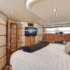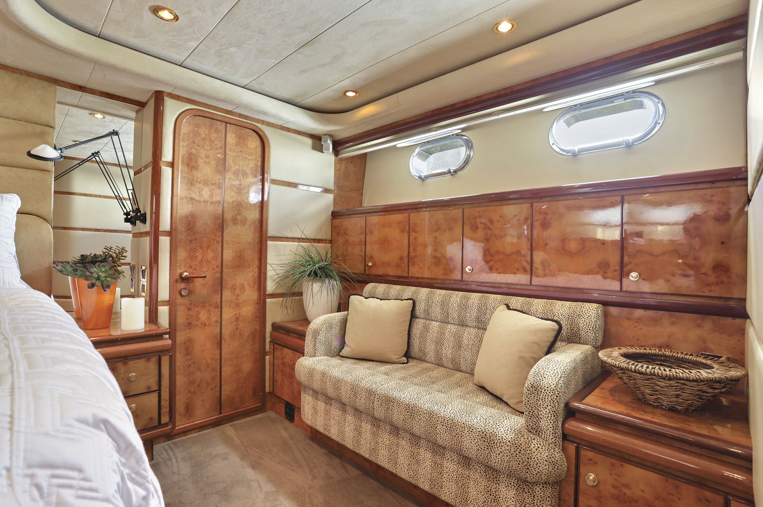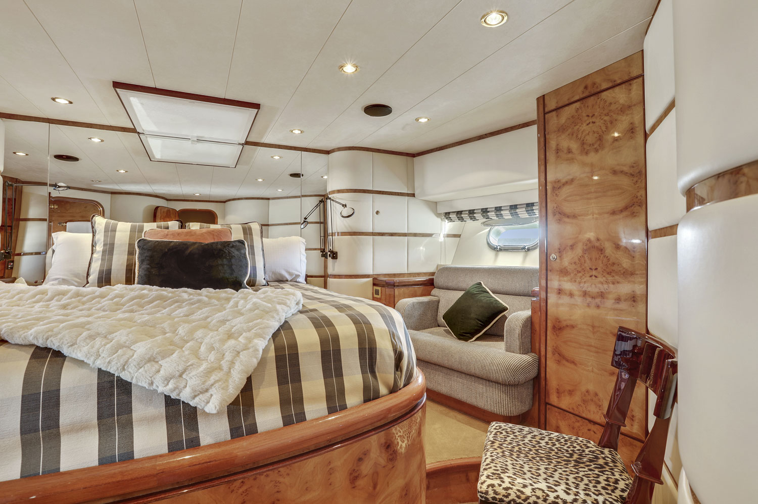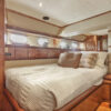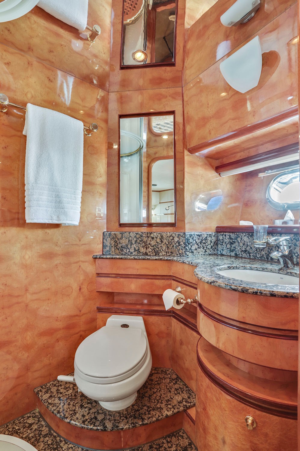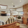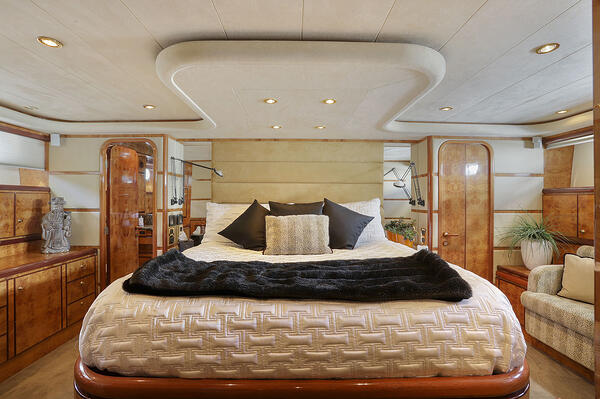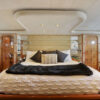 Set within an abundance of glass-smooth cheery woodwork is a centerline island, king-sized berth with twin nightstands, vanity to port, and large hanging lockers to starboard. The stylish king-size bed has a padded headboard flanked by two glass mirrors which expand the apparent size of the room. Details include a plush carpet, desk, walk-in closet, entertainment center, love-seat to port, pop-up vanity station, doors made of solid wood, hull-side windows and a Samsung 40-inch LED HD TV, and of course, copious amounts of hand-crafted cherrywood cabinets.