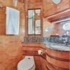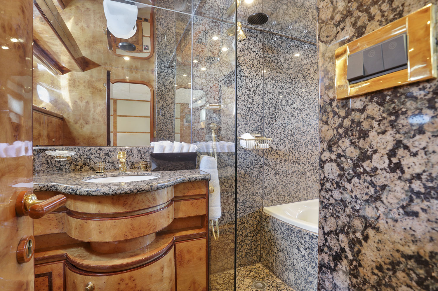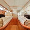 As you make your way forward from the master stateroom, the interior design from the salon continues on. To port is the first of 3 guest cabins. This cabin contains two single berths and ensuite head and shower (to aft) where marble tiles and cherry wood abounds. Twin portholes bring in light and the berths’ headboard mounted mirrors reflect it (which makes the room seem longer). There’s ample storage and, of course, an entertainment center.