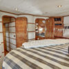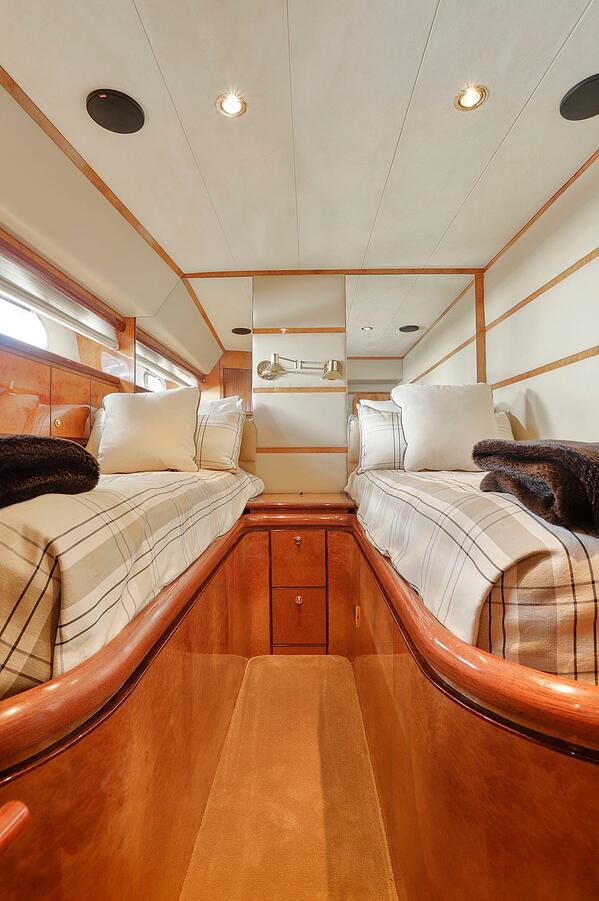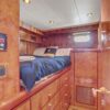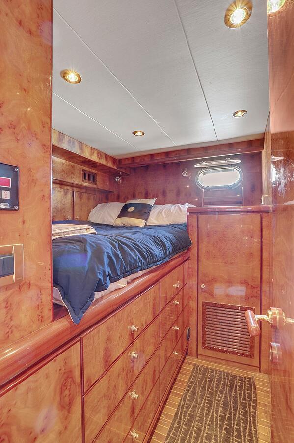 Situated all the way forward are the crew quarters (accessible outside, via the bow hatch with ladder access and steps). Such an arrangement retains the privacy of the guests from the crew. Found within the crew quarters are double stacked bunks with a private head, shower and entertainment system. Surprisingly, the cherrywood theme carriers on into this cabin. Providing your crew with a touch of luxury, too. Because of this, this room could possibly function as a sort of make-shift guest room for a teenager (if all other rooms are full).