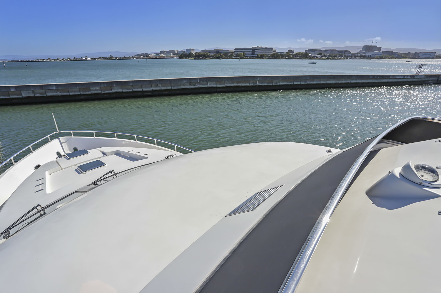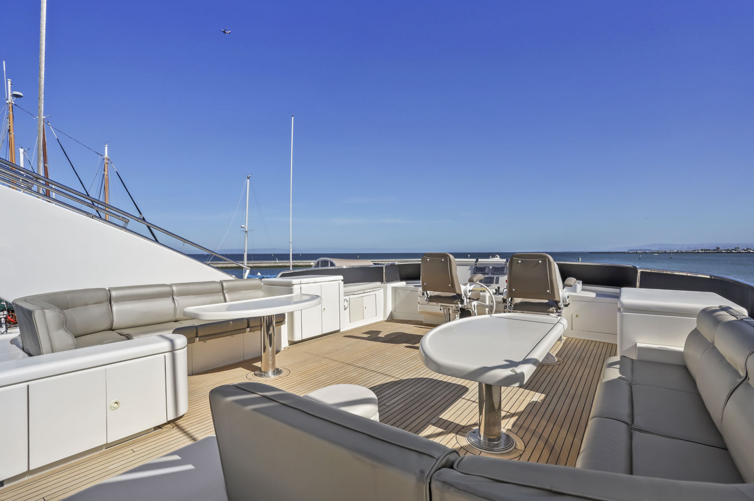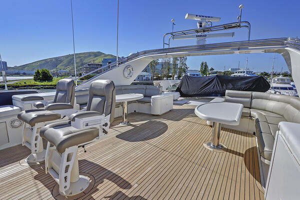 And as for the lounge area, it’s decked out with twin L-shaped settees with seating for 10 with a built-in high-low, fiberglass tables, wet bar, and Jenn-Aire barbecue. There is plenty of extra room for loose furniture so you can easily accommodate more guests. Moreover, there’s also plenty of storage throughout for whatever you may need to spend an afternoon on the fly.