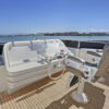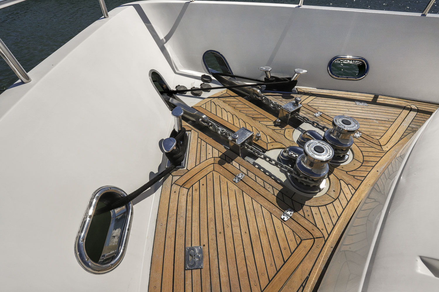 To the aft, there is a boat deck wide enough to carry a 16ft Nautica tender launched via a low-profile Quick Lift davit. This additional aft space on the flybridge will allow you to carry additional water toys (paddleboards, kayaks, whatever you desire to for more fun on the water). As for the fly-bridge helm, it is set to centerline with two chairs: a captain’s chair (to centerline), and a passenger chair to starboard.