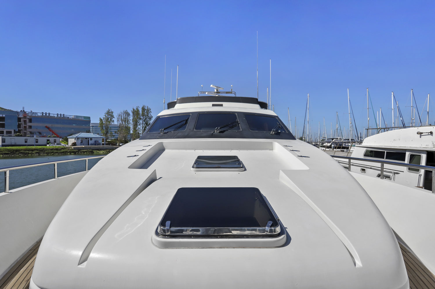 Despite being built in GRP by Taiwanese yard Monte Fino, she has an unmistakable Italian profile. She combines sharp lines, curves, steeply raked bridge, and large tear-shaped salon windows. At 79.99ft (24.38m) long, and 20.01ft (6.1m) wide, and 4.30ft (1.31m) in draft, YACHT LADY is unusually spacious. Due to her wide-body (full-beam) design, YACHT LADY foregoes amidship side-decks for an extra-wide salon and flybridge