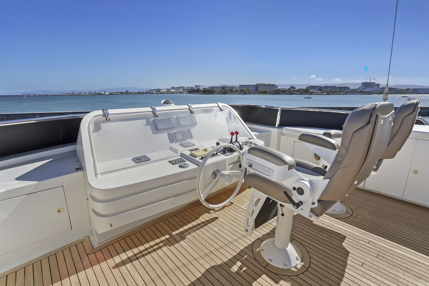 Two things come to mind when you ascend the cockpit staircase to the flybridge: it’s unusually OPEN and it’s W-I-D-E. Here you see how the wide-body really pays off. Beyond this, because the flybridge superstructure is swept back, and there is no fiberglass hard-top, you get a grand view. An uninterpreted view for watching the setting sun and the stars above. Bimini rails do exist if you prefer to shade.