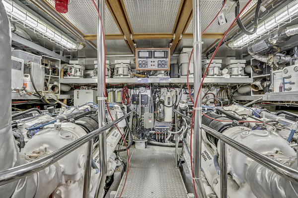 To reduce the sound of these mighty engines while running, many steps were taken. First, double sound insulation was put into the forward bulkhead. Second, the engines exhaust underwater. Third, the full-beam master suite amidship is separated from the engine room by the large ensuite head. The result? You can have a normal conversation inside the yacht without the need to raise your voice.