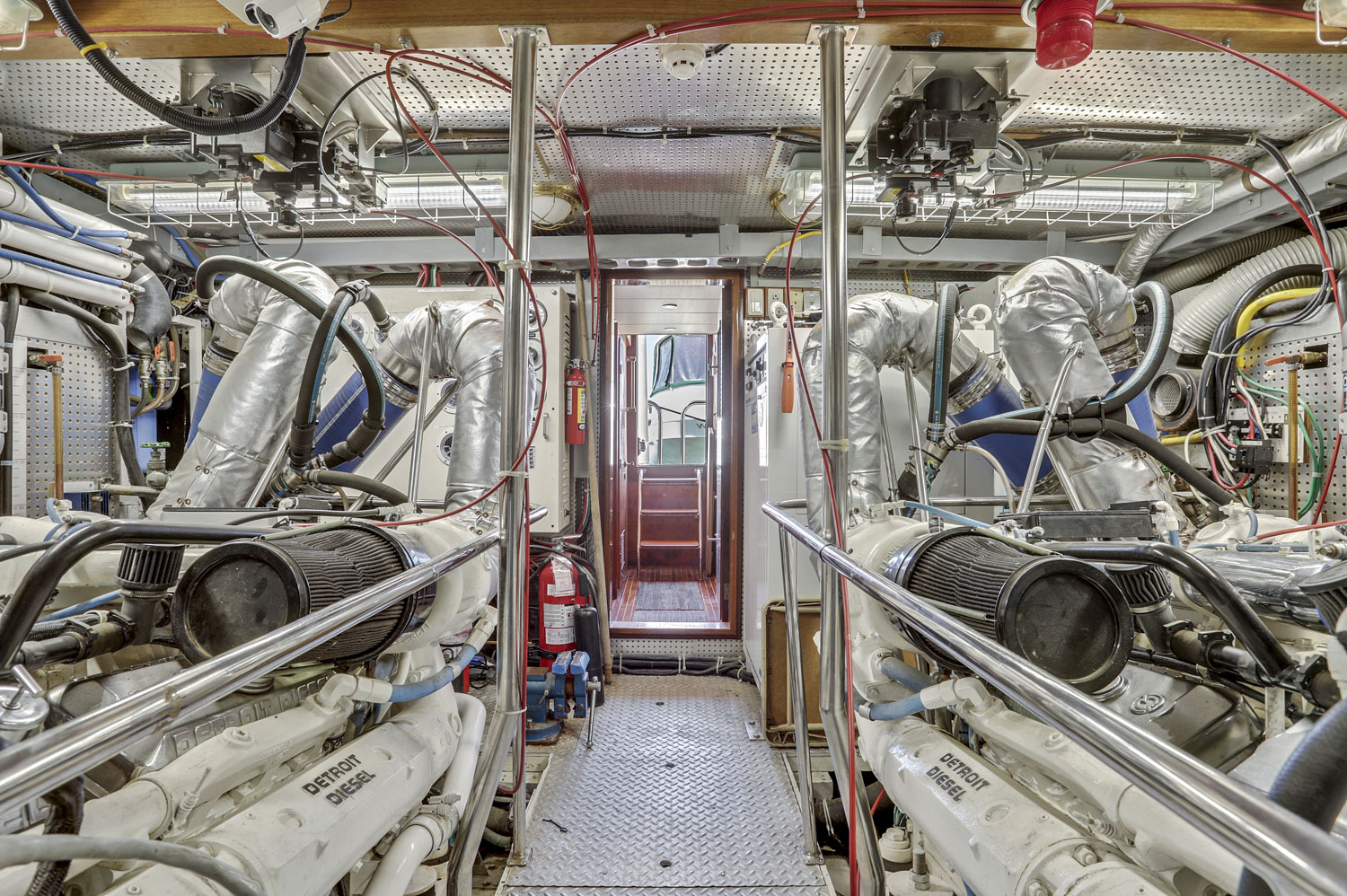 Now, as for the engine room itself, it was obviously designed to make maintenance easy and safe. Railings surround the engines to prevent accidental falls onto the hot blocks. Furthermore, it could be said that the engine room is a repairman’s fondest dream. Because YACHT LADY has been fully spec’d for the American market. This means a repairman can walk into any marine hardware store in America and buy spare parts.