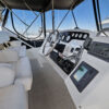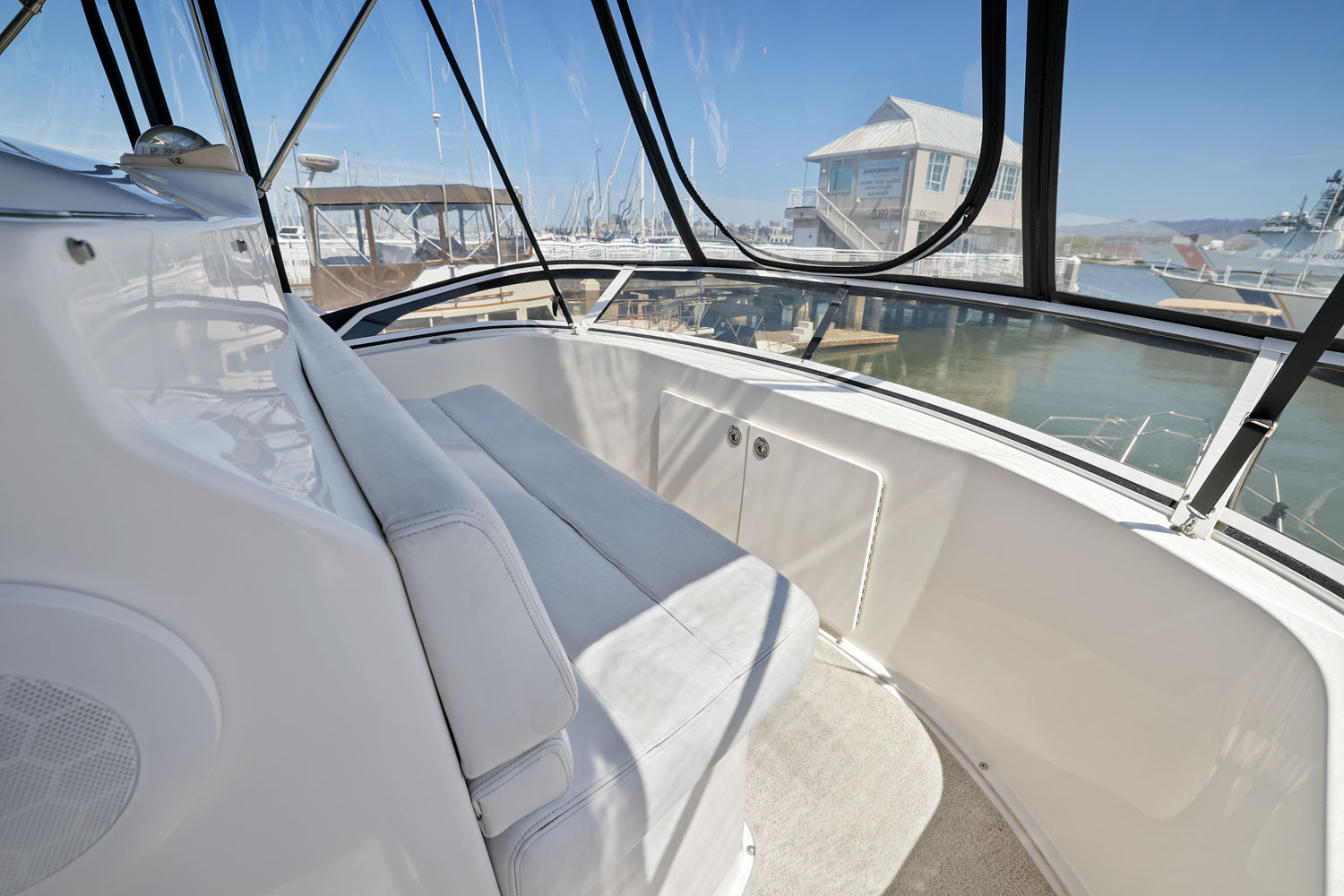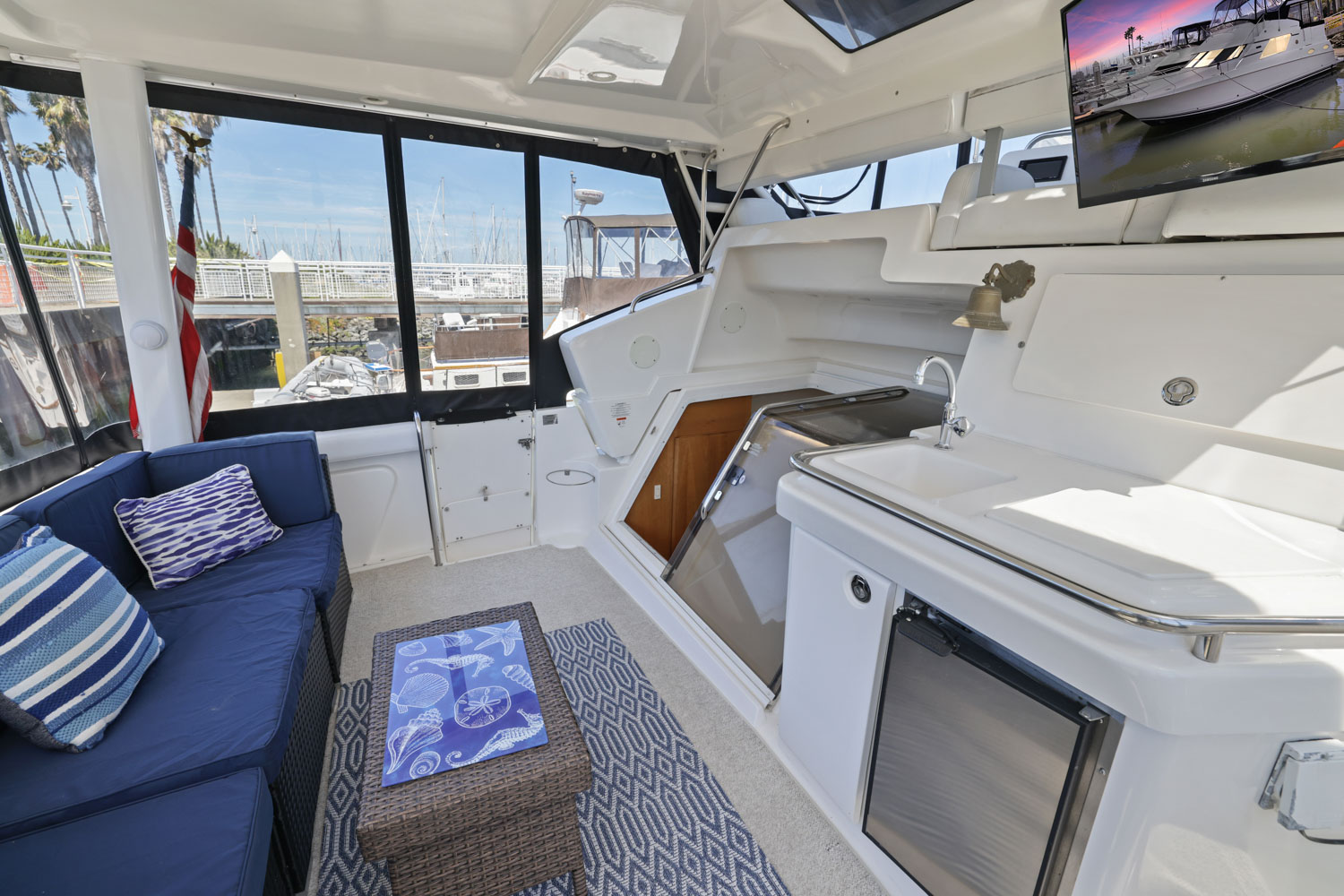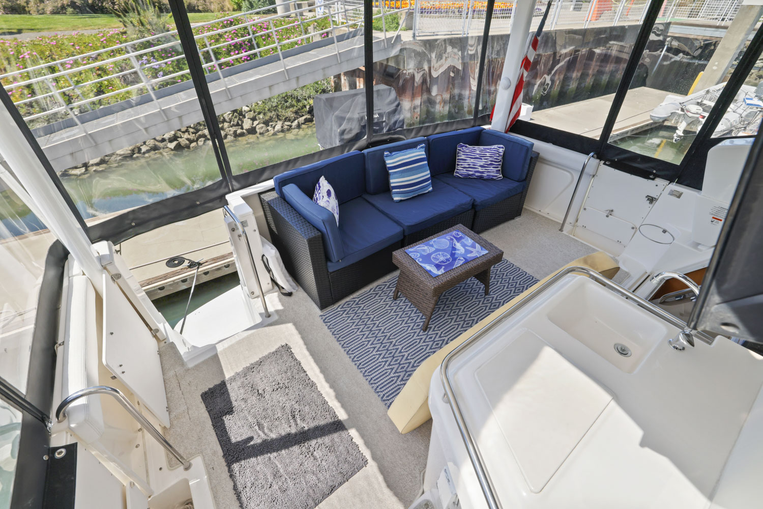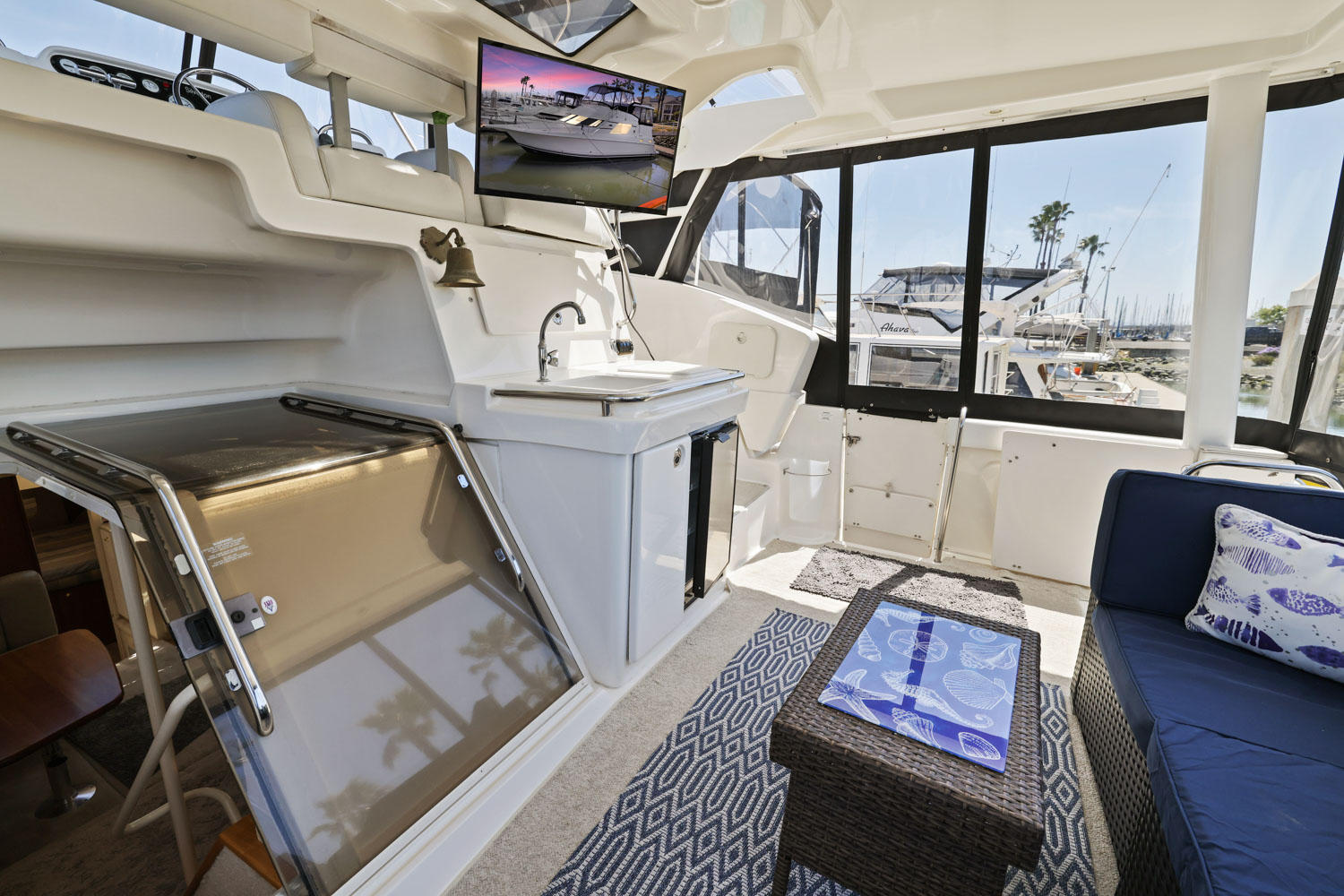 The spacious fly bridge of the 372 includes a contoured tripled helm seat and comfortable forward bench, with plenty of leg room for all passengers and a centerline command station for the helmsman. Short steps lead down to the inviting aft deck, complete wet bar, and ice maker.
