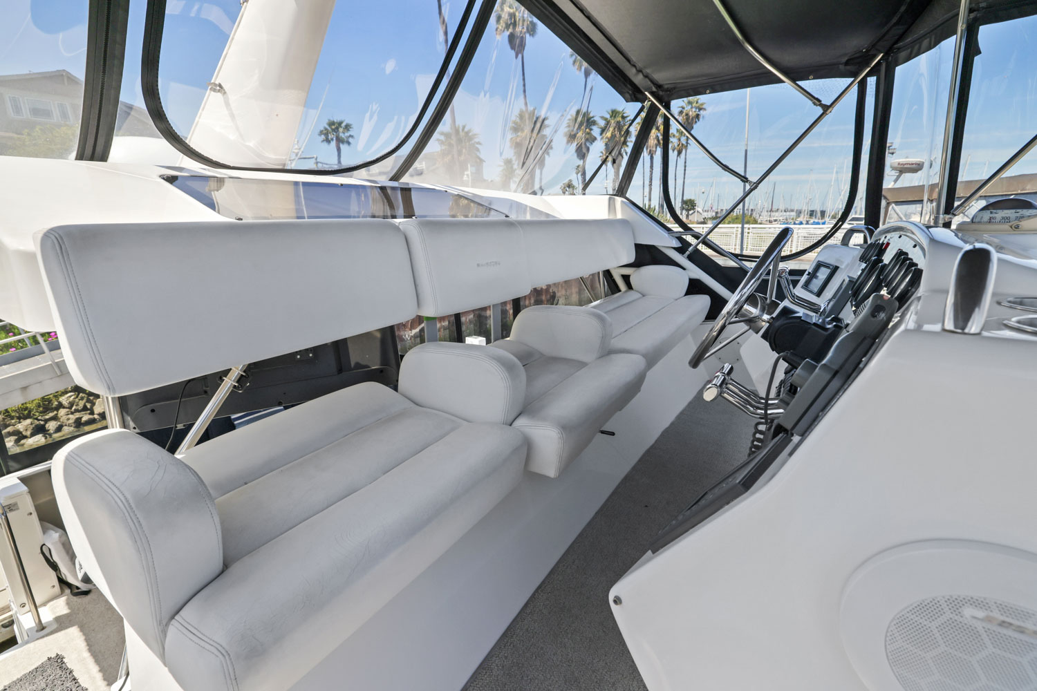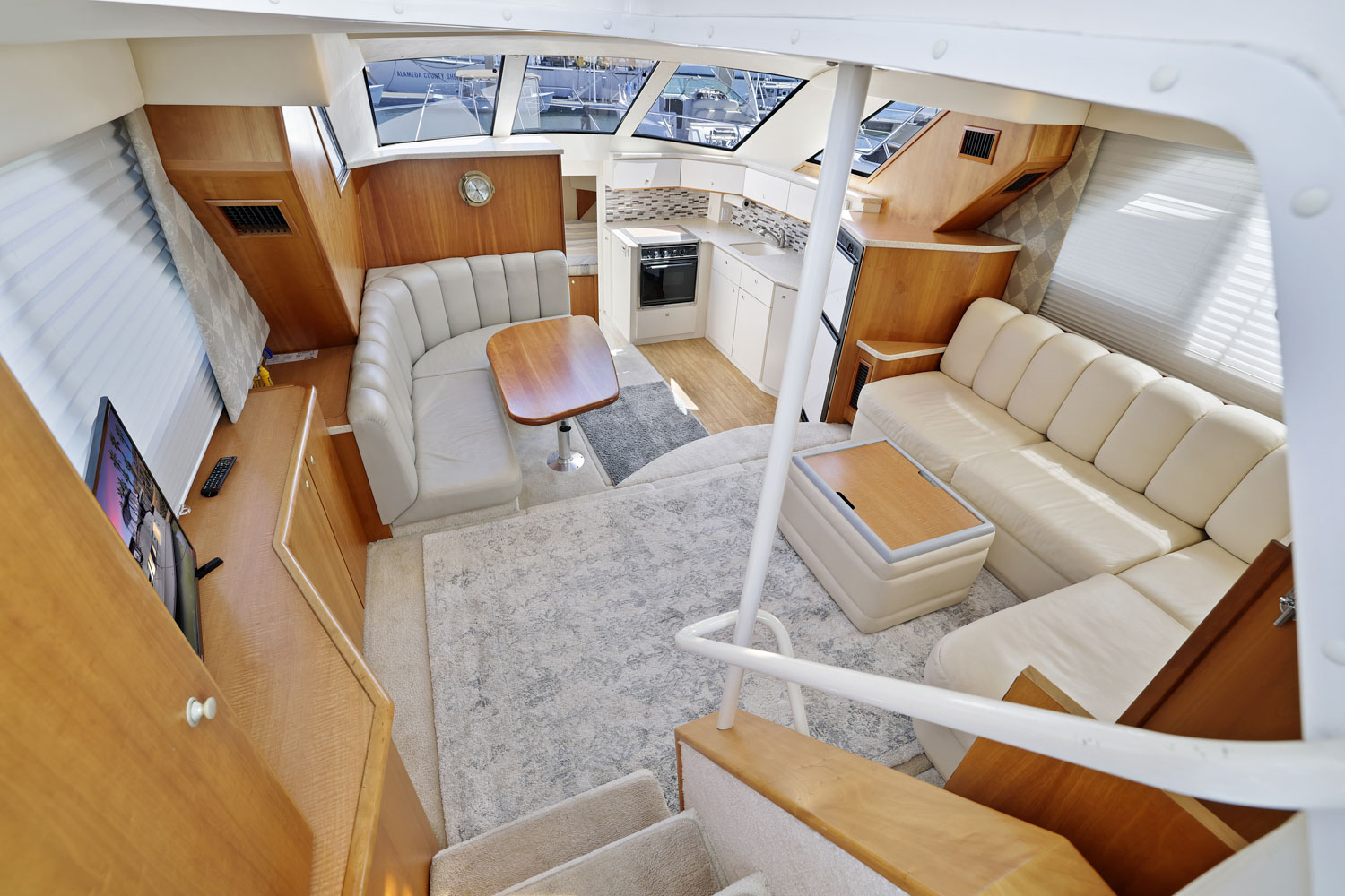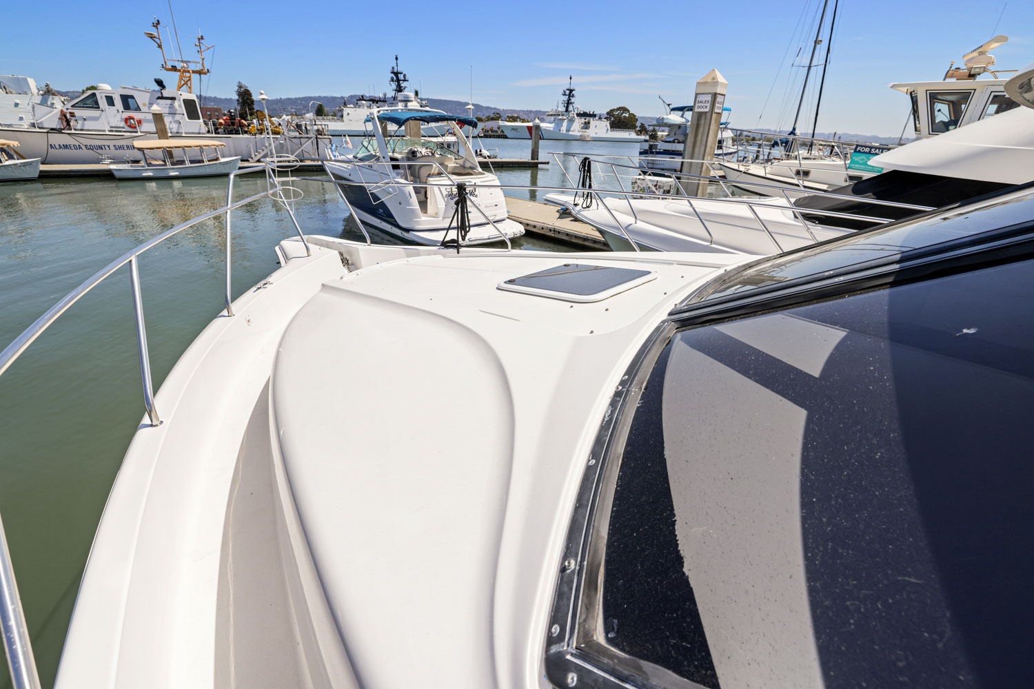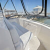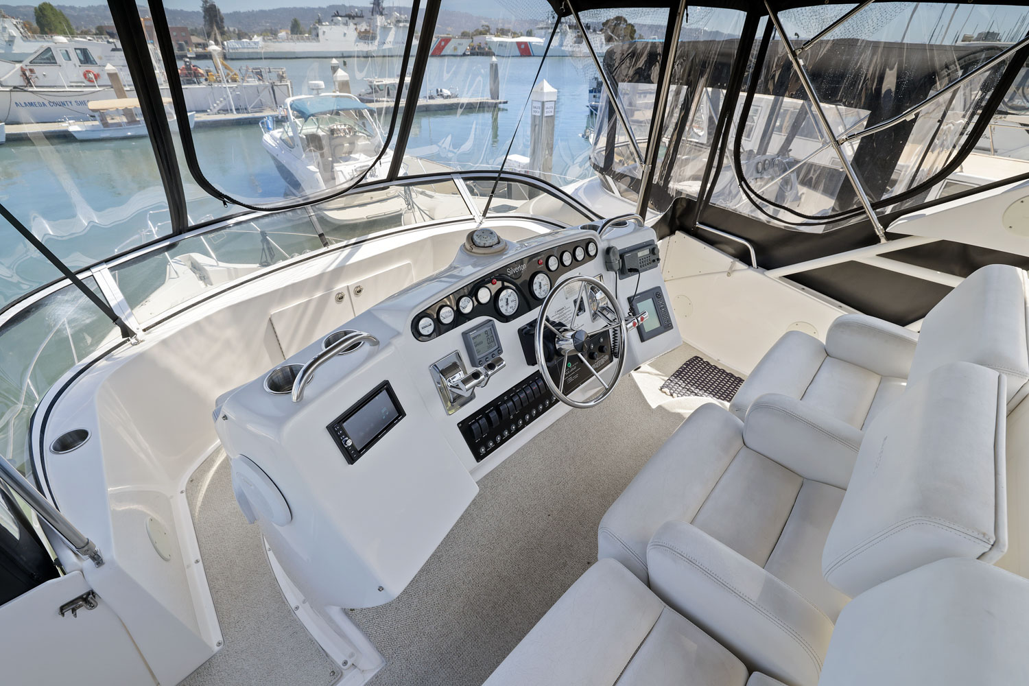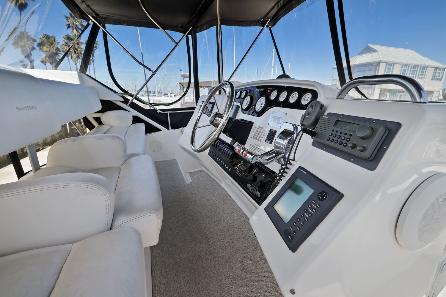 The spacious fly bridge of the 372 includes a contoured tripled helm seat and comfortable forward bench, with plenty of leg room for all passengers and a centerline command station for the helmsman. Short steps lead down to the inviting aft deck, complete wet bar, and ice maker.