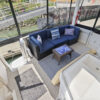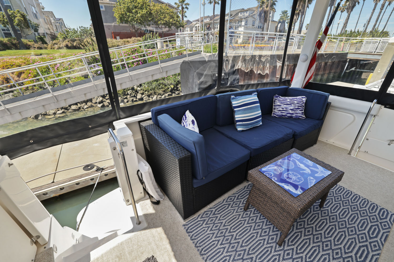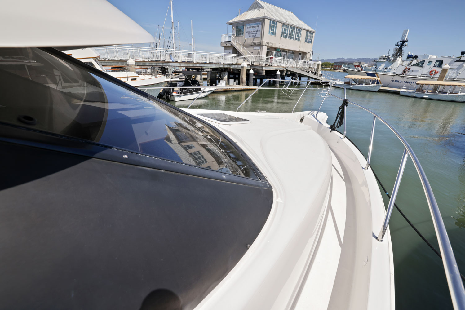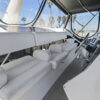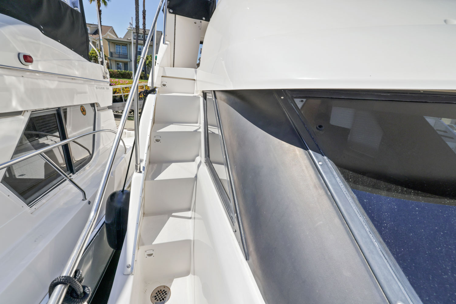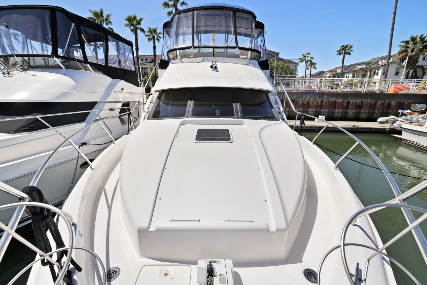 The spacious fly bridge of the 372 includes a contoured tripled helm seat and comfortable forward bench, with plenty of leg room for all passengers and a centerline command station for the helmsman. Short steps lead down to the inviting aft deck, complete wet bar, and ice maker.