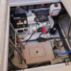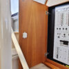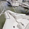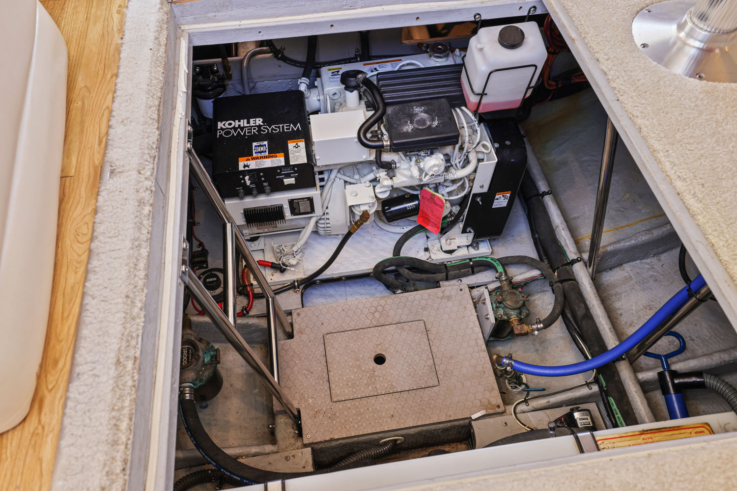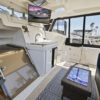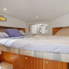 Down below, a sliding acrylic hatchway allows entry from the aft deck, descending just a few steps into a great open grand salon with 6’4″ headroom in all areas. A comfortable L- shaped sofa is to starboard which is also a sleep sofa, entertainment center cabinetry to port. An L-shaped dinette lounge is in the forward corner of the salon, just one step down from the main level. The galley is starboard, step down and forward to the private guest stateroom, with dual hanging lockers and berth plus private access to the day head, which also includes a separate shower stall.